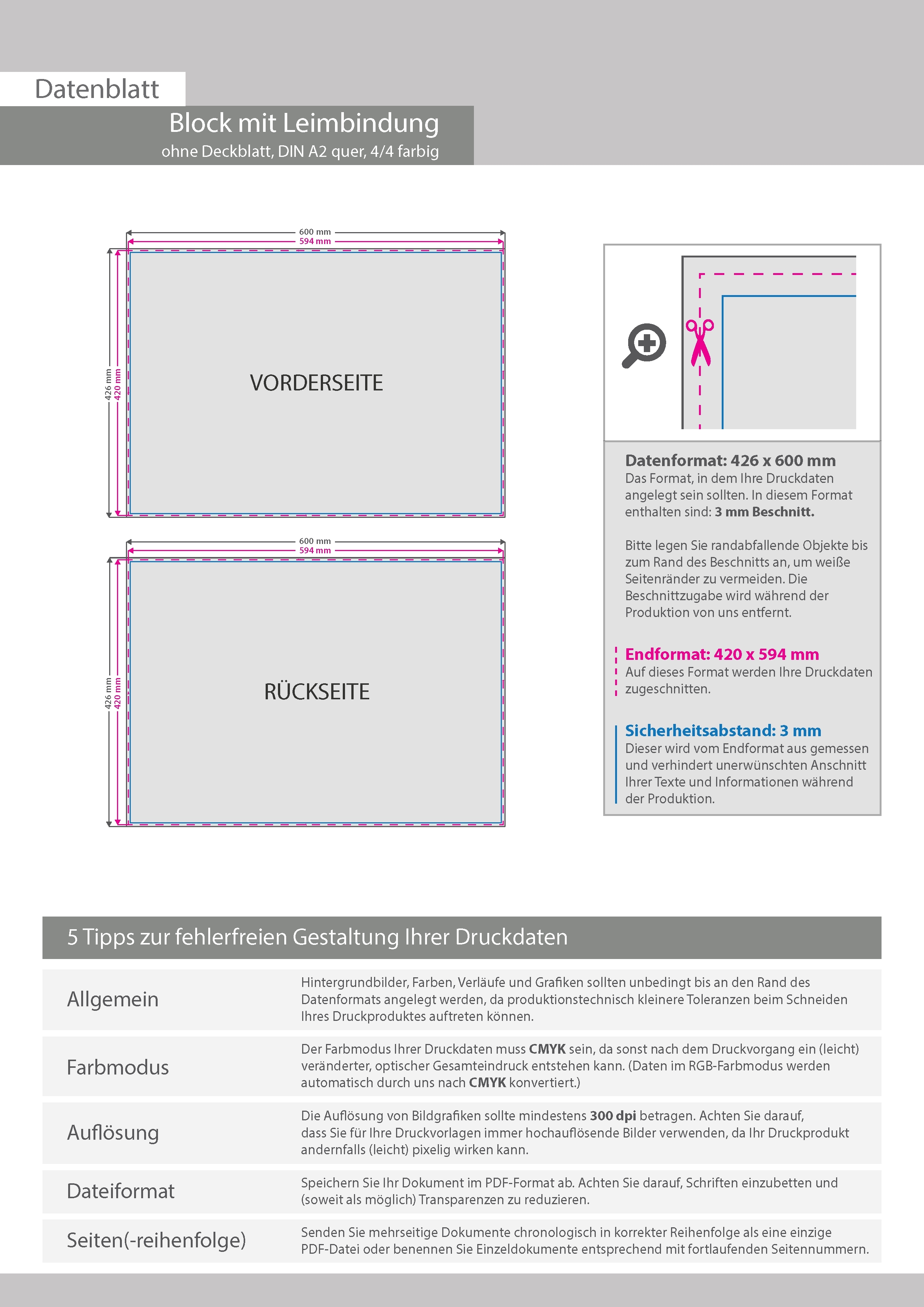 Block mit Leimbindung, DIN A2 quer, 50 Blatt, 4/4 farbig beidseitig bedruckt